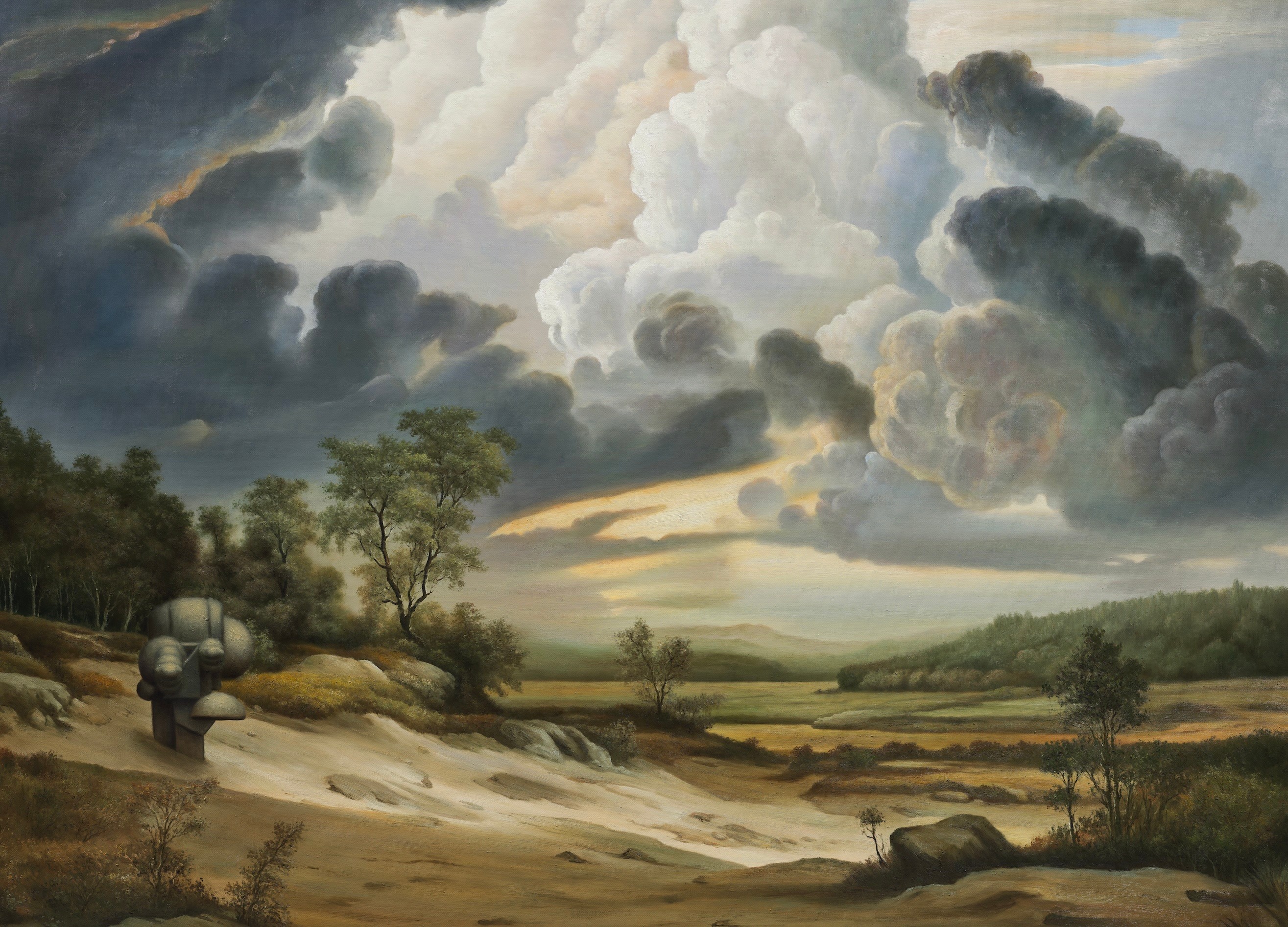 In this body of work, DeJardin’s Guardians are seen embedded within sprawling, ethereal landscapes, pointing to the duality of human existence—being at once earthly and divine, fragile yet immutable. The artist's landscapes, with their controlled palette and particular emphasis on atmosphere, are evocative of the enigmatic landscapes of 17th century Dutch Golden Age painters such as Aelbert Cuyp, Jan Both, and Aert van der Neer. Much like these old masters, DeJardin integrates symbolic qualities to reflect on moral and religious themes that transcend time. Redolent of this propensity for covert meanings, the Guardian figures in these works appear concealed within the paintings—whether shrouded in vegetation or tucked away within vast scenery—encouraging the viewer's eye to wander, actively seeking out an interaction with these figures.
